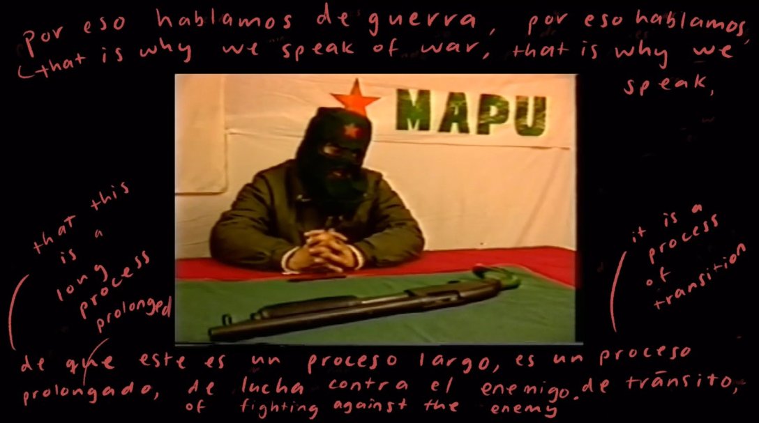 En Vecino, vecino (Camila Galaz, 2022) los tiempos se superponen. Cuando las crisis aprietan, no hay temporalidades rígidas y las imágenes vienen a poner en tensión esa linealidad. El cortometraje revisita material de archivo de un documental francés del año 1986, que se superponen con algunas tomas directas del estallido social chileno de 2019. En 1986, el grupo armado MAPU Lautaro, se preparaba para atentar contra la dictadura del genocida Pinochet; sus videos explicaban cómo empuñar un arma, cargarla, limpiarla, entonando una radicalización de la lucha para llevar adelante el compromiso militante. El funeral de Rodrigo Rojas de Negri, las entrevistas a su madre, son imágenes que producen un centelleo en la memoria, demostrando la perversidad que puede encarnar el aparato represivo. La contracara: una resistencia que insiste, persiste y arremete con radicalizaciones en su accionar. A pantalla partida, vemos a un encapuchado del MAPU Lautaro empuñar un arma; en la otra pantalla, en digital y en contextos actuales, una mujer joven imita sus gestos y movimientos. Pero está muy claro: está vez, no toma ningún arma. Los ataques de la represión, sin embargo, son los mismos: en plena dictadura en 1986 y en el estallido del 2019. Sobre la pantalla partida, el cortometraje interviene la imagen, con palabras escritas, sobre la lucha, la revolución, pero también con las cartas que, con ayuda de google translate, la directora envía a su hermano. Alejado de la narración en primera persona, pero con la misma fuerza en amalgamar lo personal con lo político Vecino, Vecino recorre la historia chilena y trasvasa las historias de resistencia generacionales, encarnadas nuevamente en 2019, proponiendo un novedoso tratamiento formal sobre la imagen, y atisbando algunas miradas críticas hacia la generación de los xadres.