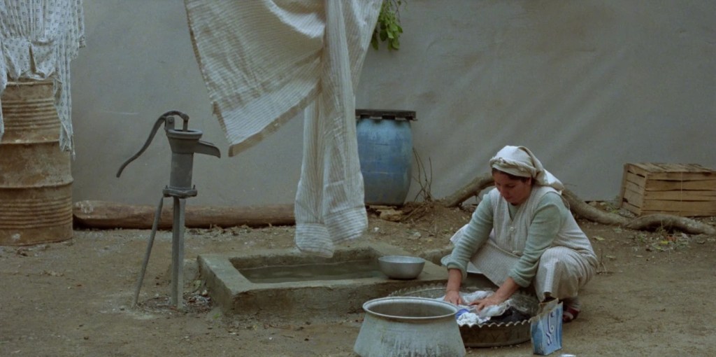 Las imágenes de este grado cero se extienden a los tendederos de Valparaíso Mi Amor (1969) de Aldo Francia cuando la vecina se encuentra colgando sábanas ajenas recién lavadas. Irrumpen lxs hijxs del compadre preso jugando en el espacio de la artesa. Las sábanas limpias caen al barro. Lxs niñxs salen fuera de cuadro tras la ira desatada de la lavandera.