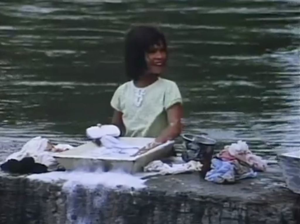 Al lado de estas imágenes: la niña que sonríe con las manos enjabonadas en El hombre cuando es hombre (1982) de Valeria Sarmiento, seguidamente de la mujer que suspende el lavado para saludar a la cámara en Caminos de liberación (1985) del grupo Chaski y la mujer de edad que restriega en L’ Argent (1983) de Robert Bresson. Nombrar fotogramas como quien sostiene evidencias para transparentar la operación que hay de fondo: artesas, clase y género.