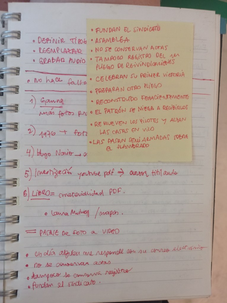5. Durante las semanas de encierro de la pandemia le doy rienda suelta a una obsesión. Rastrear y ver todas las películas posibles en dónde se representa la lucha de clases, especialmente en territorio argentino. Me atraviesa la imposibilidad de reunirnos, pero también una fina línea entre la frustración y la esperanza. Conversando de esto con un compañero, me comparte el libro Los Picapedreros, asegurando que ahí se relata la huelga más larga de la historia de nuestro país, de la cual nunca escuché hablar. Mucho más grande es mi sorpresa al leerlo, y encontrarme con testimonios orales de mujeres que participaron en los momentos más álgidos de esos once meses de lucha. Un problema de representación: esto sucedió hace cien años, y de los hechos apenas quedan palabras escritas. ¿Qué hacer?.