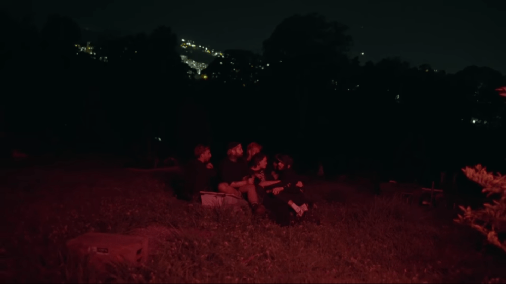 El deseo y lo queer en la película de Theo Montoya delinean nuevas trazas de una Medellín liminal, border y disidente. Hacia el final, una figura vestida de negro con los ojos rojos aparece en la habitacion de infancia, la misma locacion con la que abrió la película. La figura del director/autor también está puesta en crisis: un cadáver trasladado por la autoridad cinéfila, que, al hacerse de día, abre los ojos mientras describe todas las veces que murió en esa ciudad. El fantasma reemplaza al director. Es su fantasma quien narra el relato, pero también es Camilo, Daniel, Julián, Sergio, Lola. Sharllott, como cuerpo representativo de muchos otrxs. En la escena final, sobreviene lo colectivo: los personajes que atravesaron la película se abrazan en un sillón, en medio de un cementerio, durante la madrugada de una Medellín en vela. Las ausencias relegadas encuentran otras maneras de hacer familia. Mientras, imaginan una casa sin paredes, sin ventanas, sin muebles, donde convivir con la naturaleza.