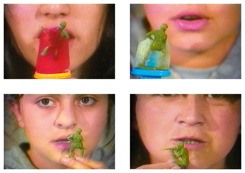 Que el nombre de esta obra esté escrito en inglés, para nosotras debiera ser más que un detalle, pues vincula al video con una larga tradición de producción publicitaria estadounidense enfocada en infantes y adolescentes, para el consumo de la golosina helada [2]. Mas, con este video, Gloria altera el orden simbólico, pero también moral y político permitido para la época: encapsula la violencia en el goce azucarado y colorido de las paletas, devolviendo esa violencia al espectador. De la mera observación, terminamos implicados con el montaje y tanto la violencia como la muerte emergen ante nuestros ojos como una denuncia. Hay algo que recrudece en la mirada, que nos hace sentido y que no quisiéramos ver/sentir. No se nos vende nada, pero tampoco asistimos a una mera descripción. Las figuras plásticas de los soldados que ingresan a sus bocas nos invitan a pensar en el potencial de muerte que está sobre y dentro de nuestros cuerpos, ya sea por acción física, emocional o psicológica. No hay goce sin muerte, diremos junto a los lacanianos. No hay capitalismo sin terrorismo militar. No hay violencia sexual sin el loop infinito de los Ave Marías. No hay estereotipos de la mujer sin moral conservadora.